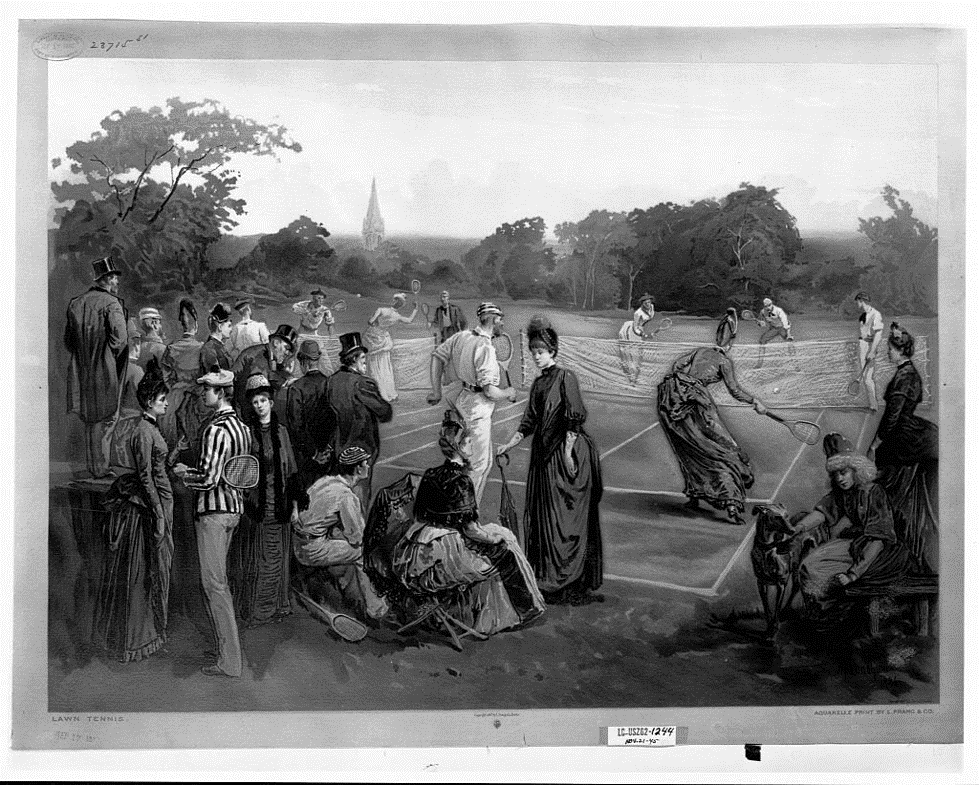 Men in suits and women in long dresses playing lawn tennis. Library of Congress—Corbis/VCG via Getty Images