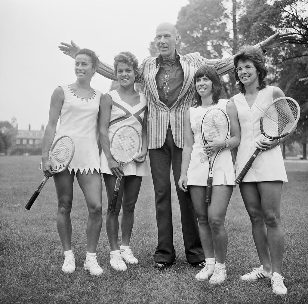 English fashion designer Ted Tinling (1910 – 1990, center), with tennis players wearing his Dacron fashions at the Royal Garden Hotel, Kensington, London, June 22, 1973. Left to right: Virginia Wade of Britain in a dress with shark’s teeth details, Evonne Goolagong of Australia in a dress with a sweetheart neckline and orange and yellow inset panels, Rosemary Casals of the USA in a dress with butterfly motifs, and Billie Jean King of the USA in a dress with a diagonal motif in lilac. Michael Webb—Getty Images